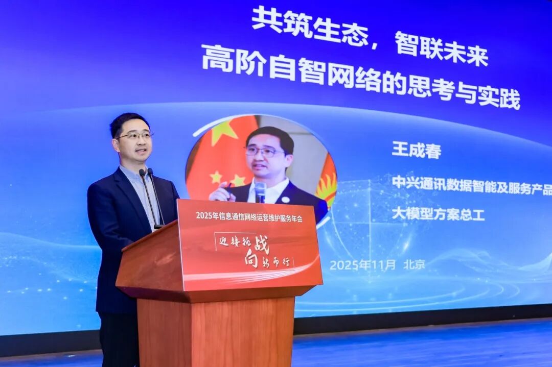 近日,2025年信息通信网络运营维护服务年会在北京隆重举行。本次年会以“迎接挑战 向新而行——筑牢‘十四五’智能运维基石,擘画‘十五五’通信网络智管新蓝图”为主题,汇聚了行业内外众多精英与专家,共同探讨信息通信网络运营维护的未来趋势。中兴通讯数据智能及服务产品大模型方案总工王成春受邀参会并发表了题为《共筑生态,智联未来——高阶自智网络的思考与实践》的主题演讲,全方位展示了其在高阶自智网络领域的技术创新、实践成果及未来规划。