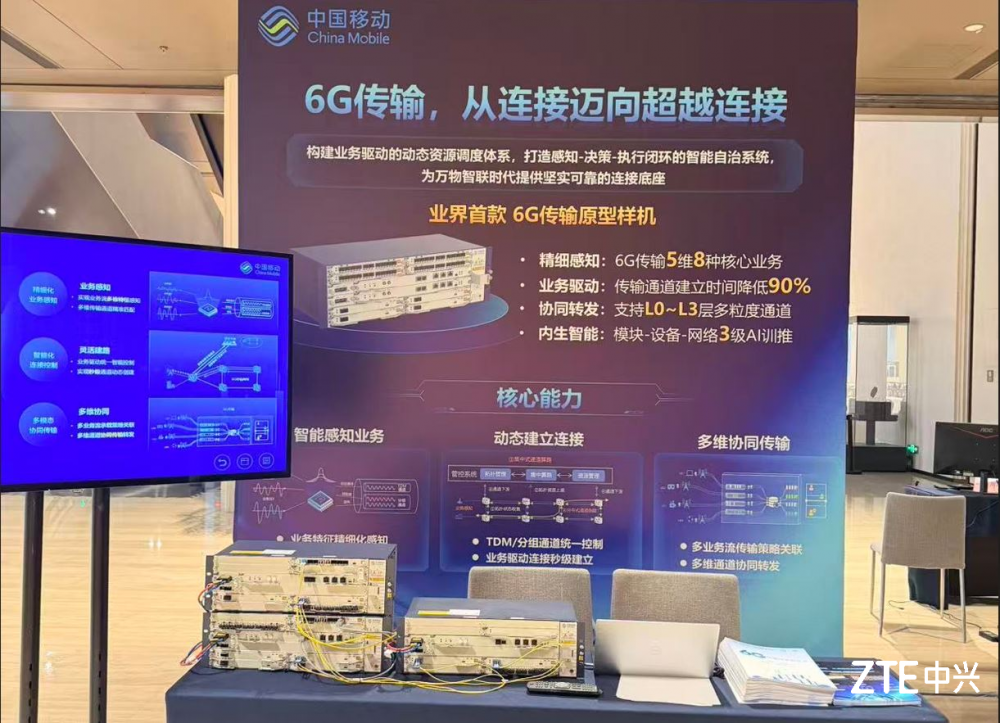 展会现场,中国移动与中兴通讯进一步联合展示了6G传输系统原型样机,并进行了业务演示,包括网络自动感知业务类型、多维通道协同、自动带宽分配部署、秒级智能开通连接等,生动呈现了6G“智慧网络”的雏形。