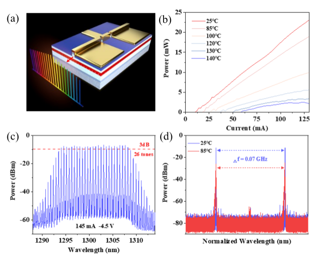 在室温(25°C)下,激光器实现了14.312nm的3dB光学带宽,可产生26个并行信道,每个信道均可承载128Gb/s的PAM-4调制信号;在高达140°C的温度下,该器件仍保持稳定锁模;在85°C的工业级标准高温下,关键性能几乎无衰减,仍能支持22个信道稳定工作,实现总量2.816Tb/s的数据传输。