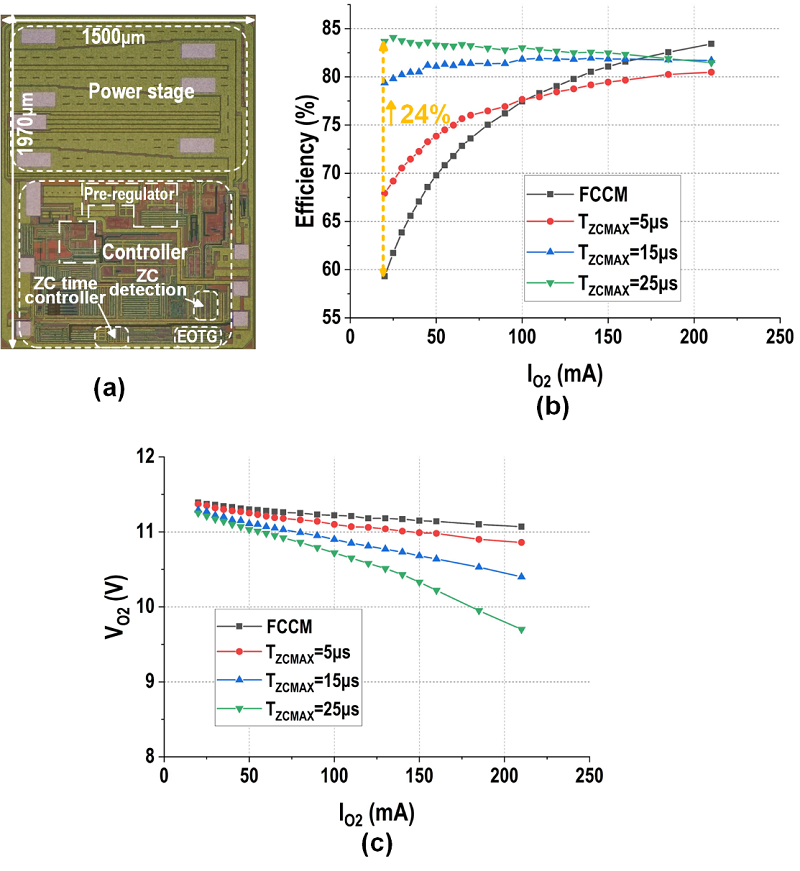 图 3 (a) 芯片照片;(b) 测试得到的不同零电流时间限制下的转换效率;(c) 测试得到的不同零电流时间限制下的隔离侧输出电压