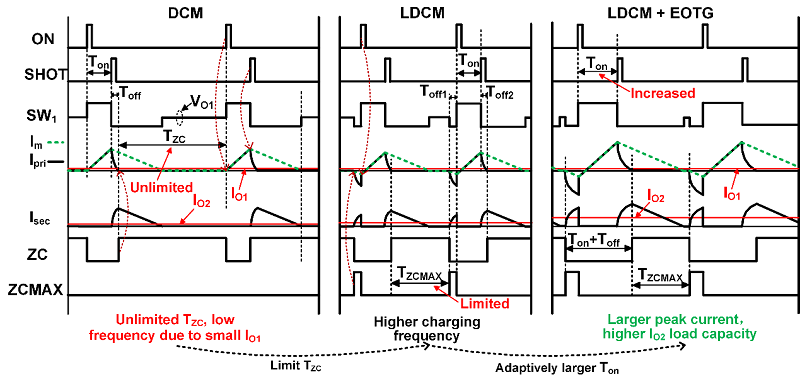 图1展示了论文[1]中提出的具有隔离侧隐性反馈的Fly-buck转换器的结构图,图2则为Fly-buck转换器在不同工作模式下的时序图。其核心改进在于,通过零电流时间控制器限制零电流时间,相较于传统DCM模式,这一措施提升了隔离侧的负载能力;而与FCCM模式相比,则能通过降低开关频率来提高效率。在此基础上,系统采用增强型导通时间发生器(EOTG)实现隔离侧的隐性反馈,在隔离侧输出下降时自适应增大导通时间,进一步增强了隔离侧的带载能力,确保系统在实际应用中的负载需求得到满足。