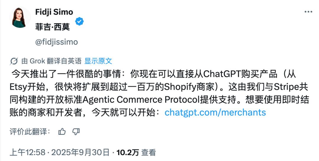 「我们希望让用户在 ChatGPT 中完成整个购物旅程更轻松, 同时也让商家和开发者能把这些对话直接转化为订单。」
