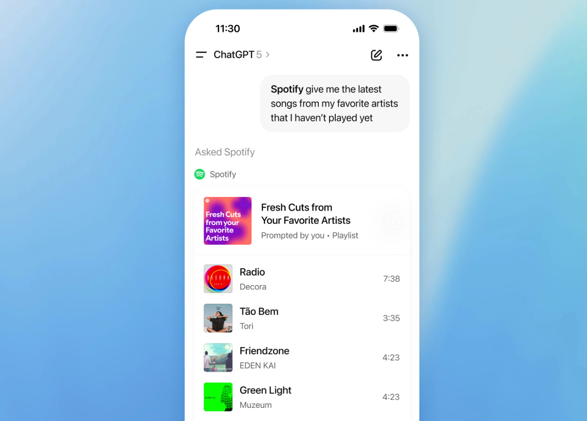 首先是直接在发给ChatGPT的信息中明确要求使用某个应用,例如要求Spotify给出“我喜欢的歌手最新推出的、我还没听过的歌单”。