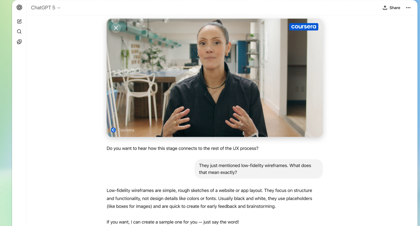也可以在ChatGPT内播放Coursera的网课,甚至可以让AI解释精确到某个时间节点的授课内容。