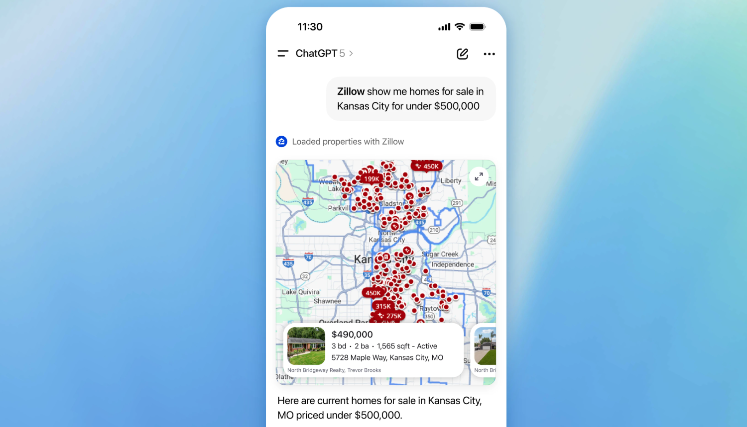 OpenAI透露,ChatGPT也会在聊天中主动推荐相关的应用。例如讨论买房话题时,ChatGPT可能会推荐Zillow应用,直接在AI聊天机器人内部展开交互式地图上,展现符合预算的房源列表。