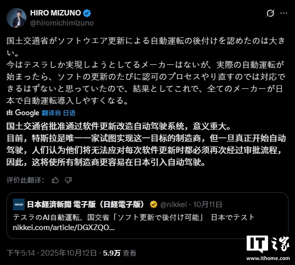 IT之家注意到,特斯拉董事会前成员 Hiro Mizuno 在社交媒体平台 X 上发表评论指出,日本国土交通省的这一决定意义重大,有望为 FSD 等高级驾驶辅助功能在日本特斯拉用户中的顺利推广扫清障碍。