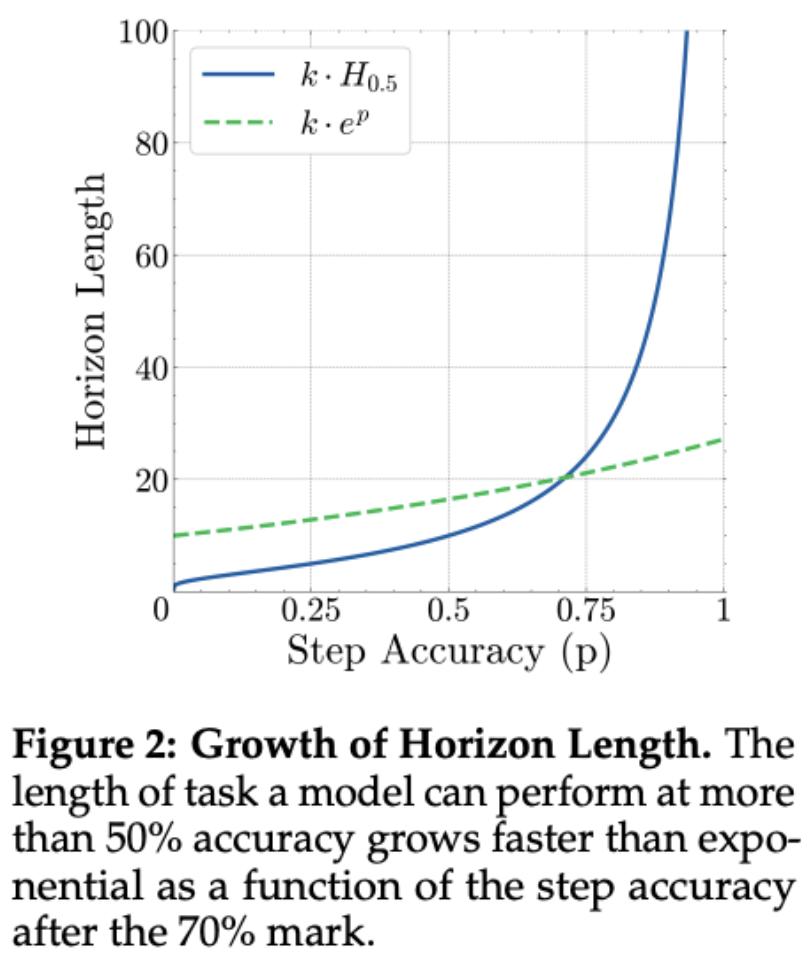 如图2所示,模型在超过50%准确率下可执行的任务长度,在单步准确率超过70%后,随单步准确率增加,而呈现快于指数的增长。