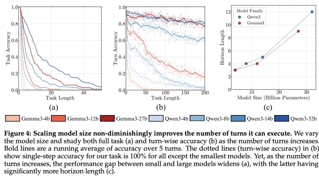 如图4,研究人员改变模型规模,并研究随着轮次数增加的完整任务准确率(a)与逐轮准确率(b)。