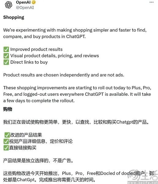 简而言之,当用户向ChatGPT描述完自己想要的东西后,ChatGPT便会在文字回复后、推荐相关性最高的产品。相比OpenAI在今年春季发布的购物功能,即时结帐功能可以说是实现了购物体验的革命。以往OpenAI只允许用户通过ChatGPT搜索商品、查看产品信息,AI给出的建议则会链接到商家的网站上,用户只能在站外完成交易。