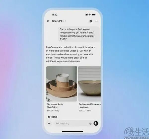 那么即时结帐功能的神奇之处在哪里呢?在OpenAI方面公布的演示DEMO中,当用户向ChatGPT询问“你能帮我为朋友找到一份很棒的乔迁礼物吗?可能是手工制作的陶瓷餐具,白色和棕色的,价格在100美元以下”后,ChatGPT不仅可以直接给出建议,而是一步到位地购买Etsy中商家的产品。