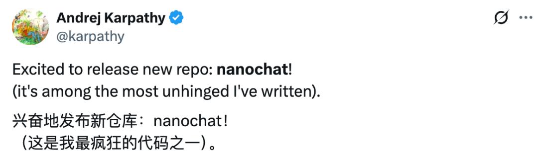 这个名为 nanochat 的项目据说可以教你从零开始,以 100 美元的成本自建 ChatGPT。它覆盖 LLM 的训练和推理,只要跟着学就可以了解构建大模型的所有步骤了。