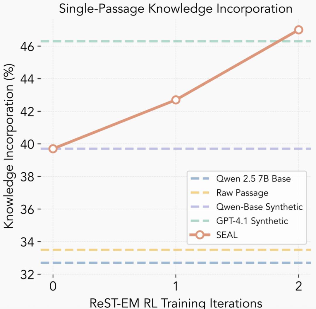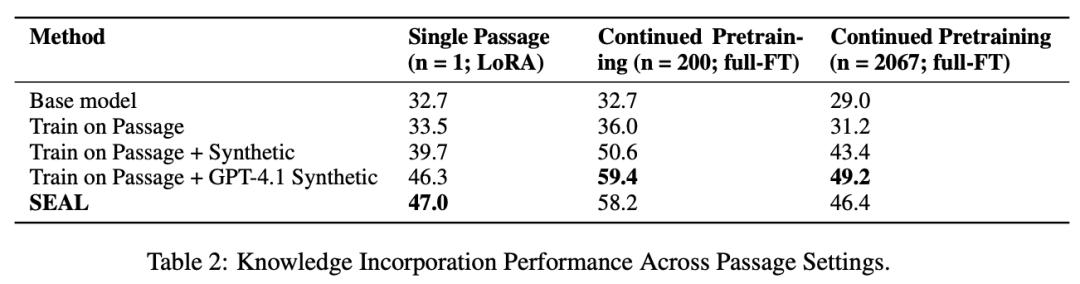 这说明SEAL不仅优于使用原文或非优化的生成数据,甚至能超越由GPT-4.1生成的高质量提示数据,表现出较强的知识整合能力。