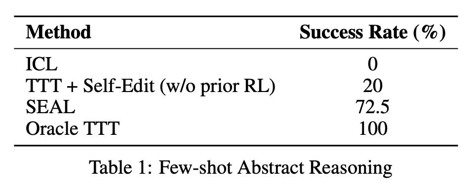 虽然不及人工设定的最优策略(Oracle TTT)的100%,但作为由模型自主摸索出的学习路径,这一成功率已充分说明SEAL具备较强的任务适应能力。