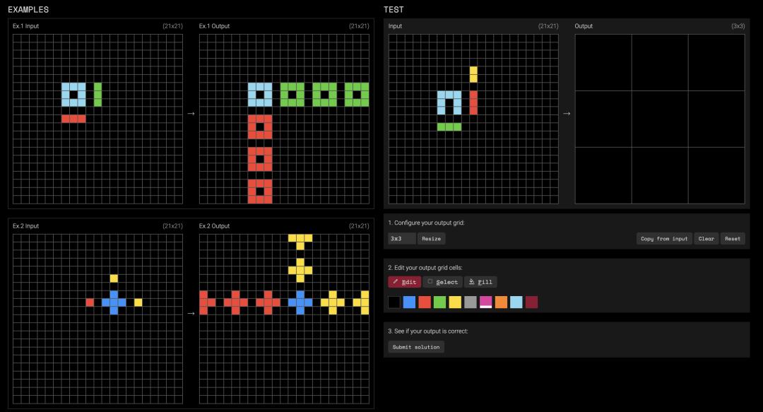 ARC任务通常包括若干个示例的图形变换(以文本形式表达)输入输出对,目的是从中学习规律并对一个新输入做出预测。