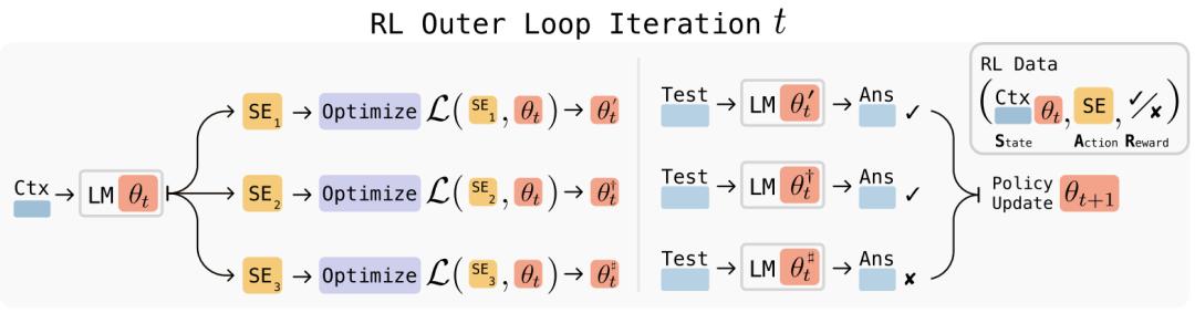 接着用这批“有效”的self-edit作为训练数据,对生成策略进行一次有监督微调(行为克隆),然后反复迭代,使得模型越来越倾向于生成有效的self-edit。