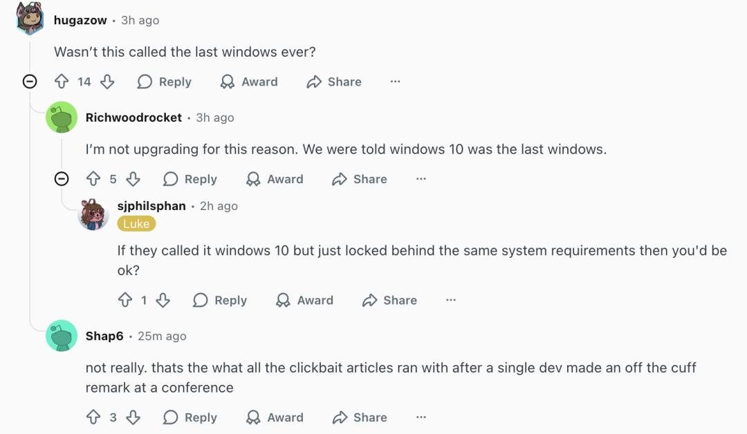 在 Reddit 上,有网友提出质疑,之前微软不是已经说过 Windows 10 是 “最后一个 Windows 系统” 吗?为什么还要强制大家更新到 Windows 11。