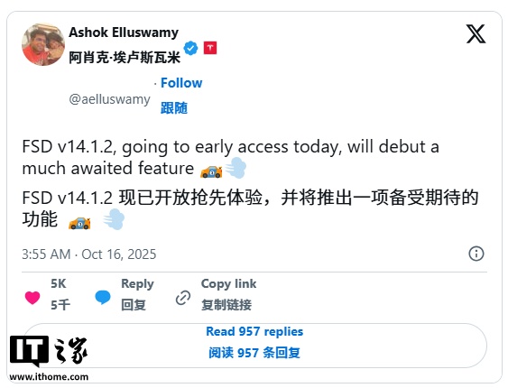 就在不久前,特斯拉刚刚发布了 FSD v14 版本,几天后又迅速推出了 v14.1.1 版本。当地时间周三晚间,特斯拉人工智能负责人阿肖克・埃卢斯瓦米(Ashok Elluswamy)透露,公司将于今日向 EAP 用户推送 v14.1.2 版本,并称该版本将“首次推出一项备受期待的功能”。