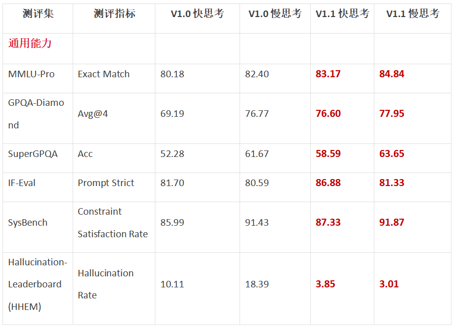 综合能力优化:在 MMLU-Pro、GPQA 等高难度测评中,快慢思考双模式成绩全面超越 V1.0;