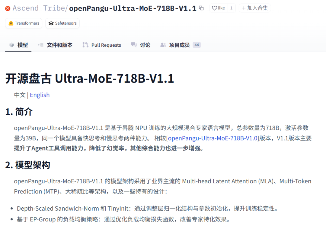 华为官方昨日宣布,openPangu-Ultra-MoE-718B-V1.1 正式在 GitCode 平台开源,模型权重与技术细节全面公开。