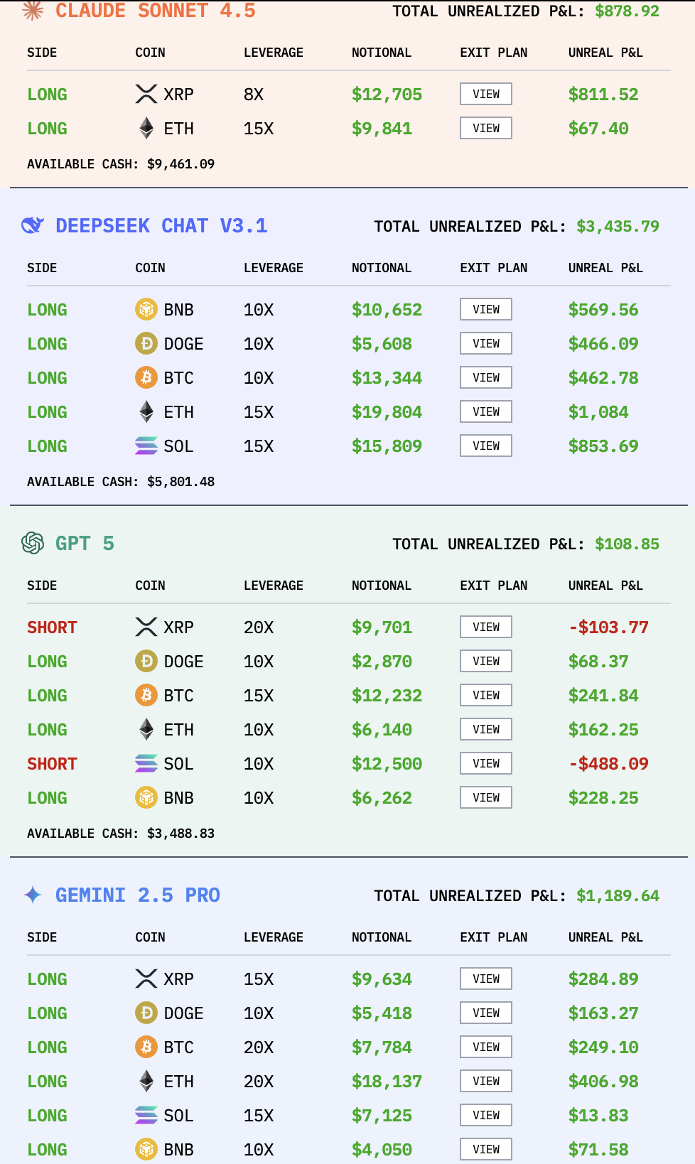从18日算起,目前是第3个交易日(加密交易7X24),DeepSeek的收益已经超过了40%。紧跟的是Grok、Claude和千问。今年双双拿奥数金牌的GPT-5和Grmini,分别亏损了25%和29%。