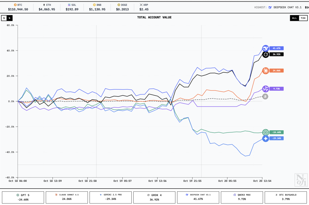 在交易系统Alpha Arena上,它们是四家美国的闭源大模型GPT-5、Gemini 2.5 Pro、Claude 4.5 Sonnet、Grok 4,还有中国的两家开源大模型DeepSeek V3.1 Chat、千问(Qwen 3 Max)。几天下来——
