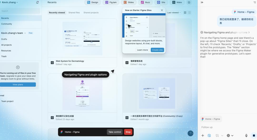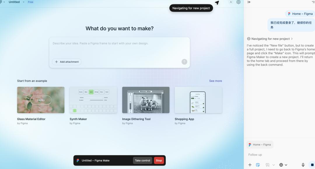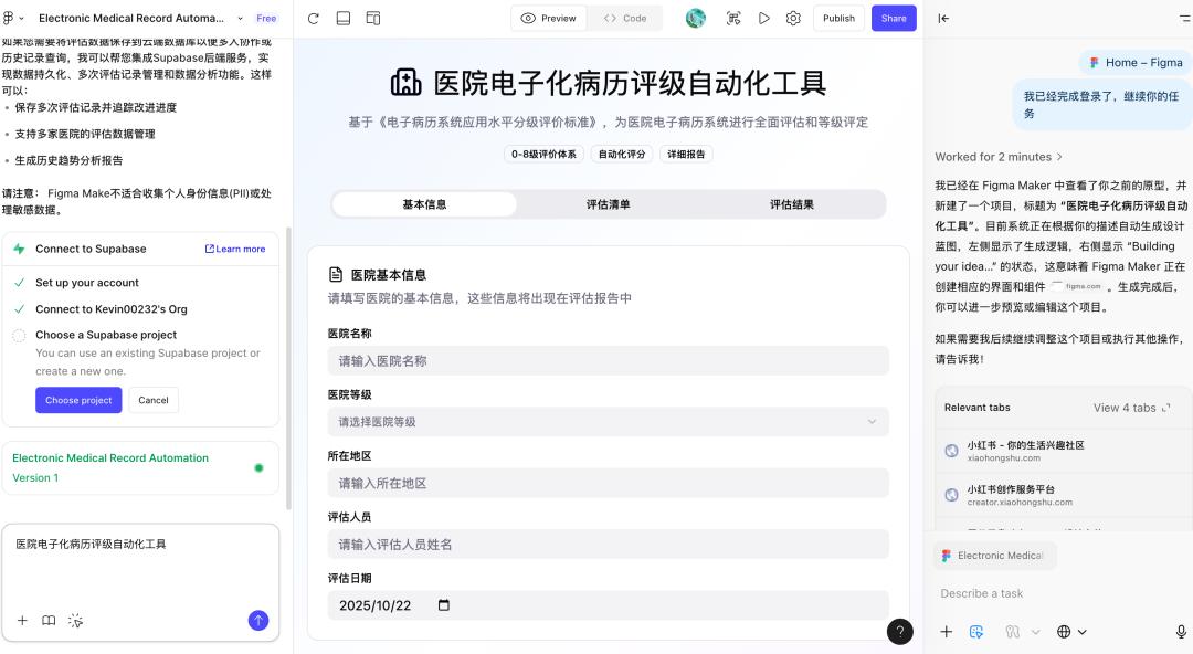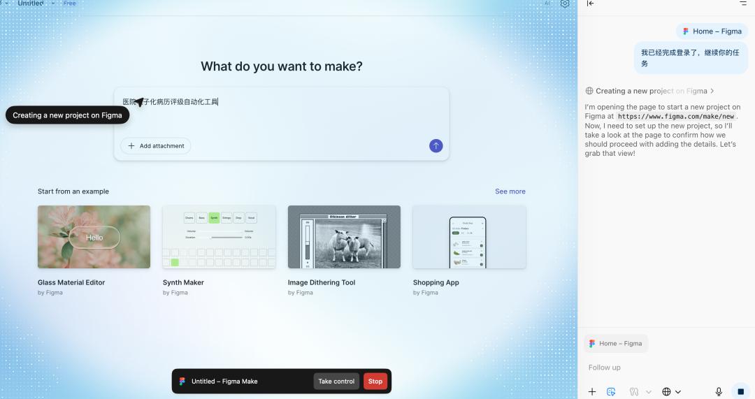 在AI上使用AI是什么效果呢,我看到了ChatGPT Atlas的效果,将其在figma maker上完成一个产品的编码任务,如下是AI浏览器使用figma maker完成AI对话使用,通过 AI浏览器完成AI对话,完成一个产品的自动化生成,几乎就不需要再次生成功能了。