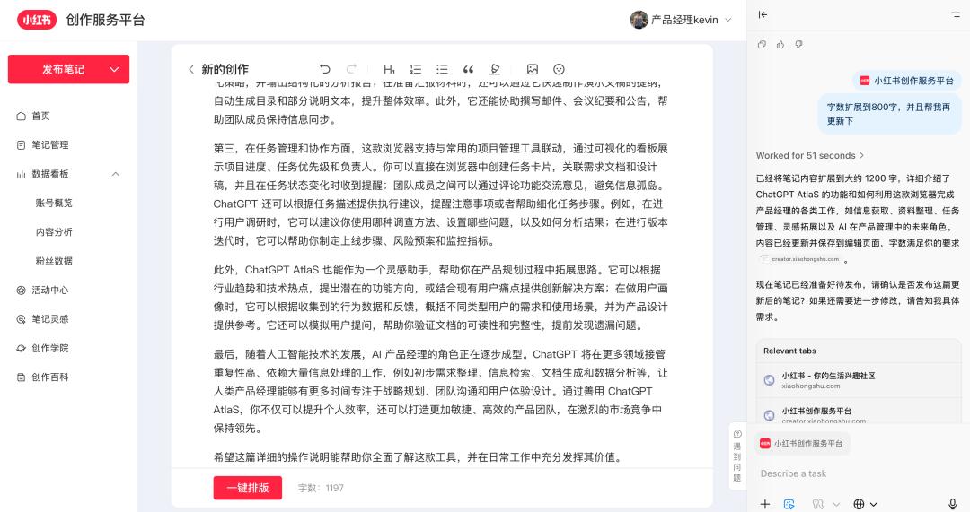 如下是最终发布成功的效果,可以看到再利用小红书官方的自动化排版,AI浏览器点击排版之后就完成了发布。