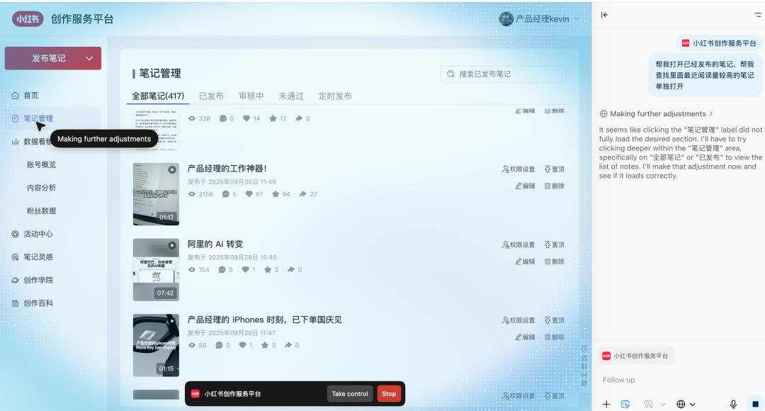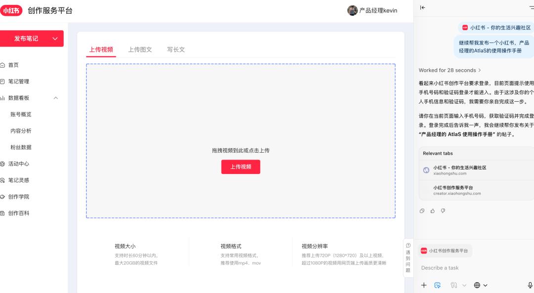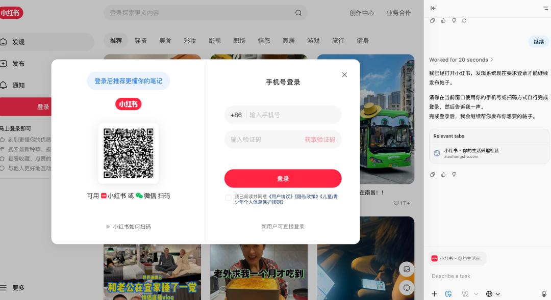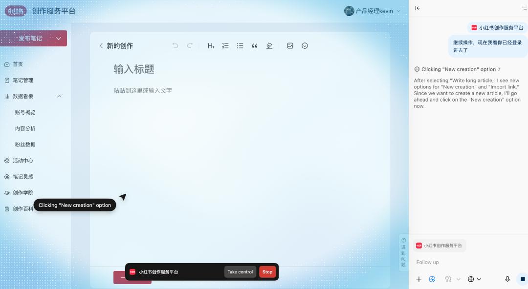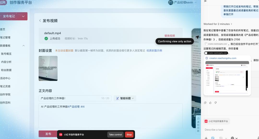 可以看到帮我写了自动化操作手册的步骤笔记,是小红书自动化发布,同时,并且整个任务通过对话完成,每一次对话都会通过视觉模型来完成下次操作,并且确定任务的完成的情况。
