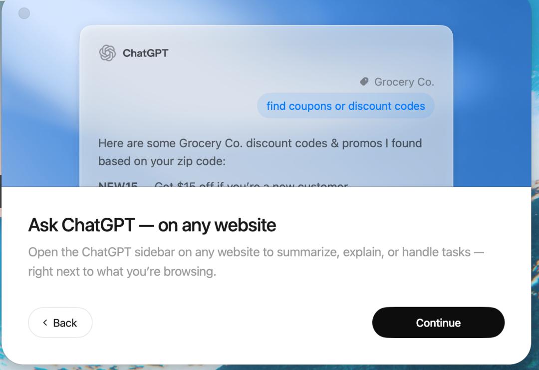 就在今天早上,ChatGPT 开始推出了更新,开始允许用户下载浏览器使用,并且在ChatGPT的对话页面给出了弹窗,并且可以下载,于是我下载了。