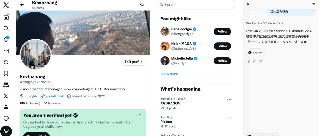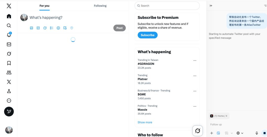 这里也同样的任务完成自动化发布Twitter,输入任务命令之后开始打开Twitter,并且开始撰写消息。