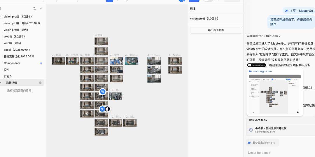 如下是AI浏览器agent模式到对应的UI设计图页面开始查看对应的数据页面,并且查找数据页面,最让我吃惊的是在项目里有多个vision PRo的项目,他可以逐步打开每一个项目进行检索。