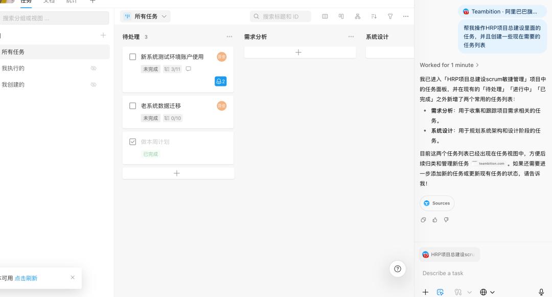 打开teambition需要首先先注册登录,并且完成授权之后就可用登录了,如下是对应的完成任务创建与卡片进度监控。