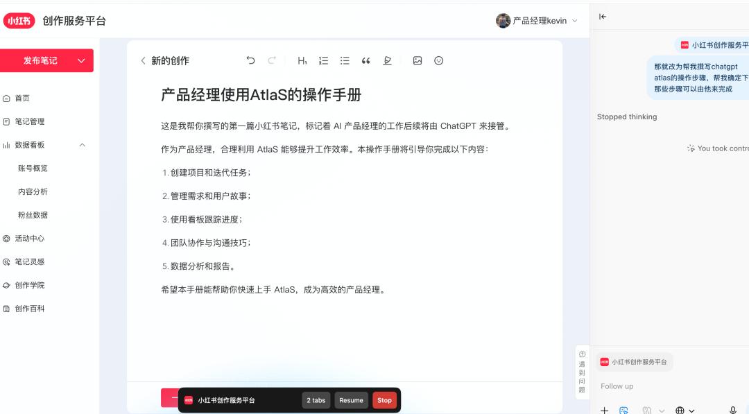 浏览器Atlas,打开了浏览器,并且查询到我笔记阅读量数据较高的(估计是用视觉模型分析)就可以帮忙整理出来,帮我点击与筛选。
