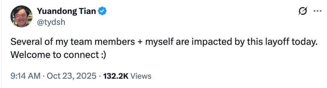 随后,华人 AI 科学家田渊栋在推特上发帖称,“今天,我和我的几位团队成员都受到了此次裁员的影响。欢迎联系我们 :)”