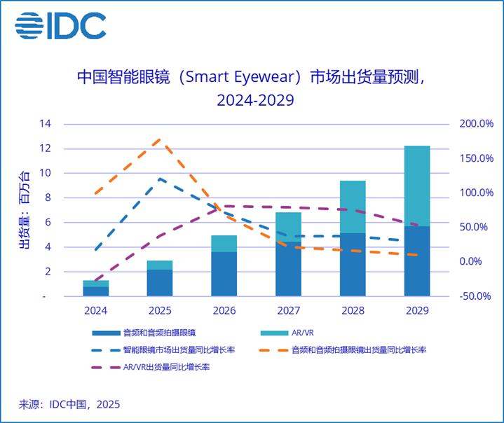 据IDC预测,中国智能眼镜2025年出货量将突破290万台,同比增幅高达121%,2025年上半年,全球智能眼镜市场出货量达406.5万台,同比增长64.2%,到2029年,全球智能眼镜市场出货量将突破4000万台;