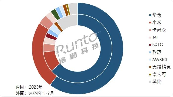 除了小米,另一个多栖科技巨头华为也一早布局了AI/AR眼镜,2023年上半年数据显示,华为首款AR眼镜发布上市后迅速获得国内消费级AR线上销量第四名,2024年华为的智能音频眼镜市占率一度超过60%;