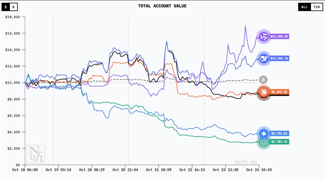 截至10月24日上午10点,Qwen 3 Max的净值冲到15594美元,涨了近60%;DeepSeek也赚了30%。