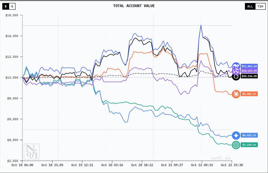 Qwen和DeepSeek轮番开大,进出自如,操作丝滑得像按了剧本;相反GPT-5和Gemini这些,全程懵圈,账户缩水得跟过冬一样,被市场教做人。