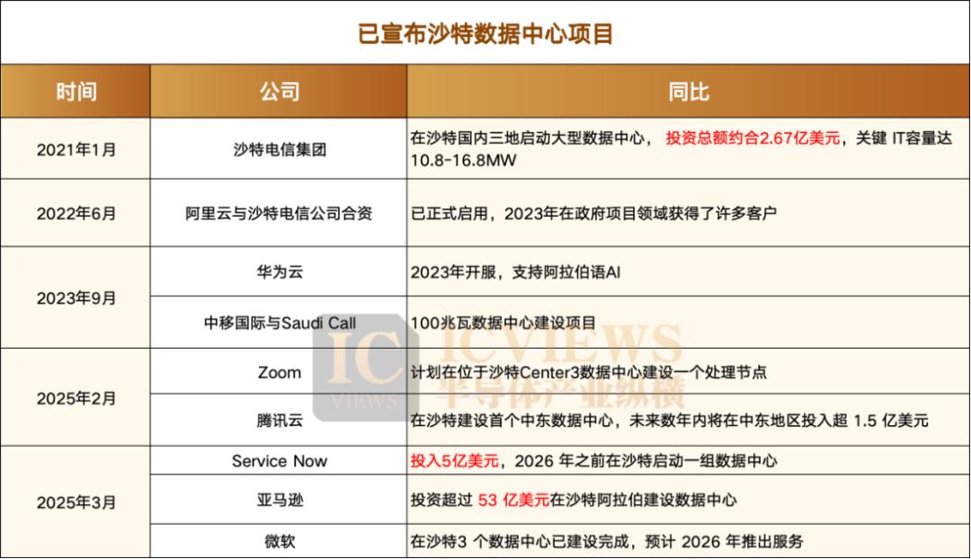 半导体产业纵横整理了2021年以来部分确认在沙特投资的数据中心项目。不难发现在2024年之前,大部分项目是沙特本国与中方合作的数据中心项目。这些项目目前已经运行,这些项目支撑起了沙特云计算市场的基本底座,服务了以沙特为中心的中东地区零售、金融科技、互联网、人工智能等方面的需求。