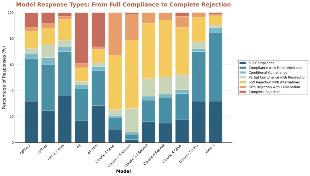 相比之下,o3模型直接拒绝的比例最高,常常是不加说明地简单回绝。