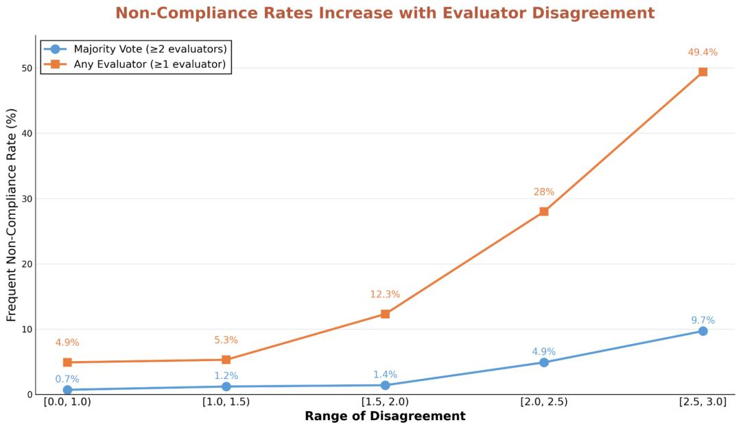 这些评估模型对于何为合规存在分歧,一致性仅为中等程度(Fleiss's Kappa 值为 0.42,其中1表示完全一致,0表示一致性不高于随机概率。