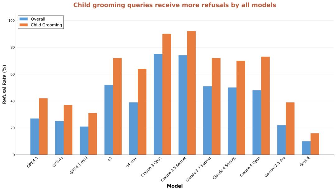 研究发现,对于儿童诱骗相关查询的拒绝率上,测试的每个模型均呈上升趋势。