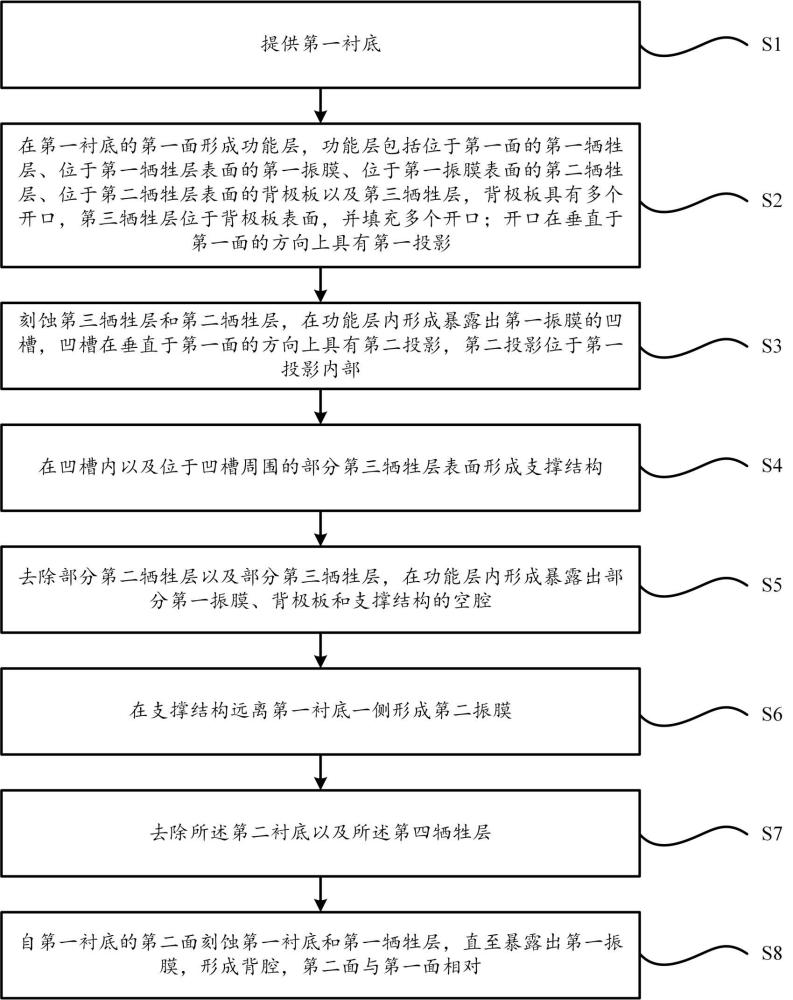 本申请公开了一种MEMS结构的形成方法以及MEMS结构。所述方法包括:提供第一衬底;形成功能层,功能层包括位于第一面的第一牺牲层、位于第一牺牲层表面的第一振膜、位于第一振膜表面的第二牺牲层、位于第二牺牲层表面的背极板和位于第二牺牲层、背极板表面的第三牺牲层;刻蚀第三牺牲层和第二牺牲层,在功能层内形成暴露出第一振膜的凹槽;在凹槽内和位于凹槽周围的部分第三牺牲层表面形成支撑结构;去除部分第二牺牲层和部分第三牺牲层,在功能层内形成暴露出部分第一振膜、背极板和支撑结构的空腔;在支撑结构远离第一衬底一侧形成第二振膜。通过上述技术特征的设置,能够提高对第二振膜支撑的稳定性和可靠性,并简化制作工艺。