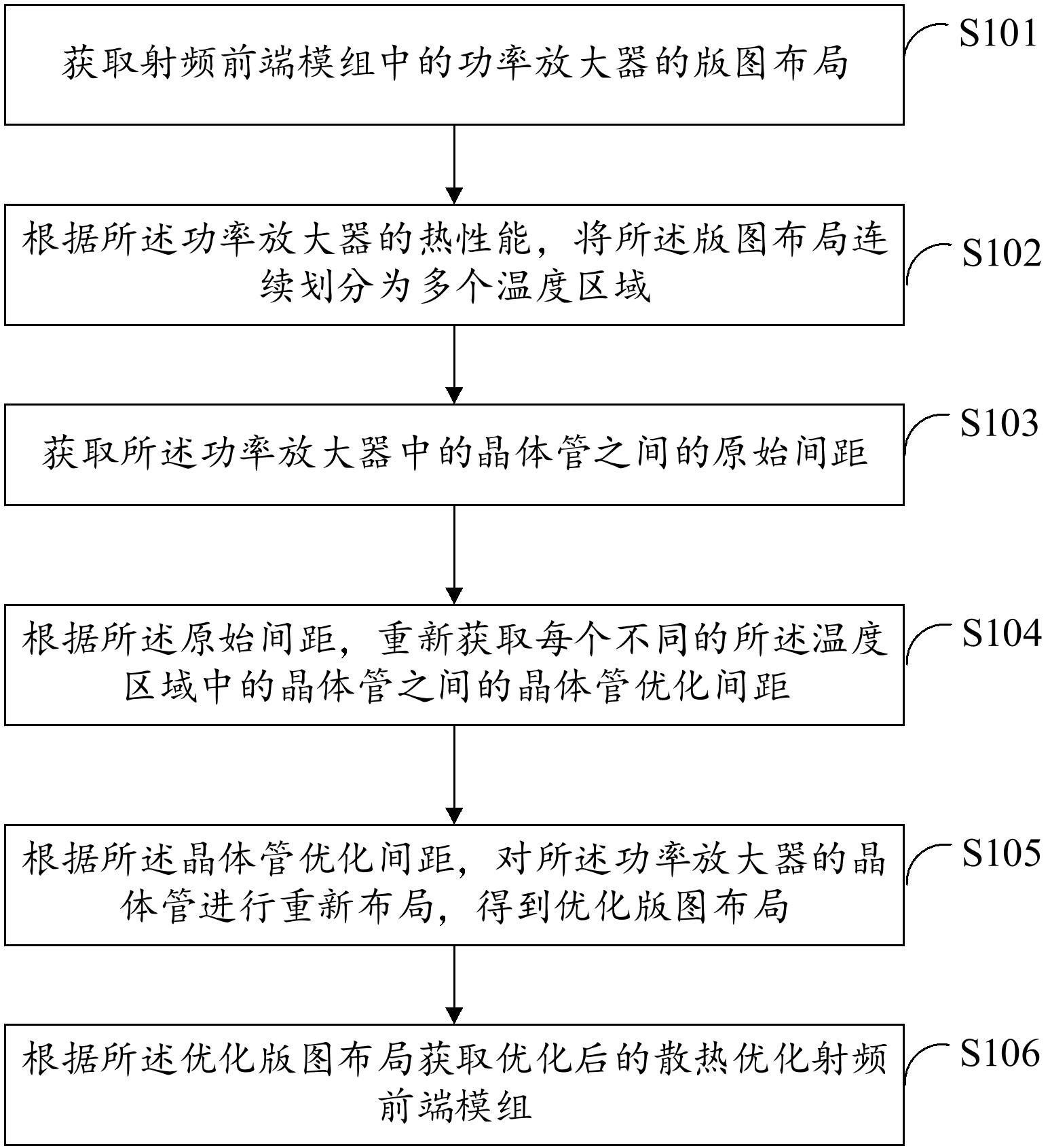 本发明涉及一种射频前端模组散热优化方法、系统及相关设备,所述方法包括:获取射频前端模组中的功率放大器的版图布局;根据所述功率放大器的热性能,将所述版图布局连续划分为多个温度区域;获取所述功率放大器中的晶体管之间的原始间距;根据所述原始间距,重新获取不同所述温度区域中的晶体管之间的晶体管优化间距;根据所述晶体管优化间距,对所述功率放大器的晶体管进行重新布局,得到优化版图布局;根据所述优化版图布局获取优化后的散热优化射频前端模组。本发明通过对功率放大器中晶体管的布局进行调整,使发热较大的晶体管之间的间距得到扩大,利于提高射频前端模组的射频性能。