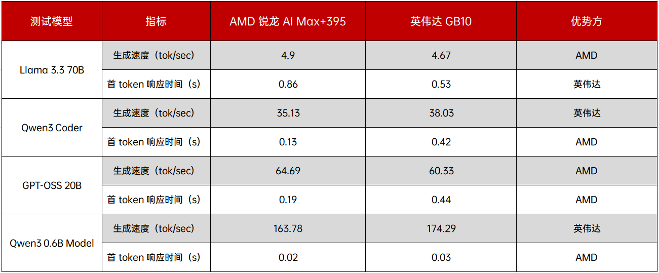 综合来看,在入门开发者高频使用的中大型模型,尤其是 MoE 架构模型(Qwen3-30B-A3B、GPT-OSS 20B)上,AMD 锐龙 AI Max+ 395 的生成速度(435.13 tok / sec、64.69 tok / sec)均和英伟达 GB10(38.03 tok / sec、60.33 tok / sec)势均力敌,且首 token 响应时间除 Llama 3.3 70B 外均更短 —— 这意味着在实际开发中,AMD 平台能更快响应,减少开发者的等待时间。