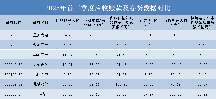 存货方面,三安光电以63.49亿元的存货规模位居首位,其存货周转天数高达134.87天,面临较大的库存压力。士兰微存货37.27亿元,周转天数131.8天,同样存在库存周转较慢的问题。