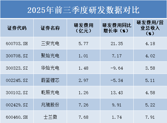 聚灿光电研发投入为1.01亿元,是七家企业中唯一研发费用刚过亿元门槛的公司,反映出不同规模企业在研发投入上的差异。