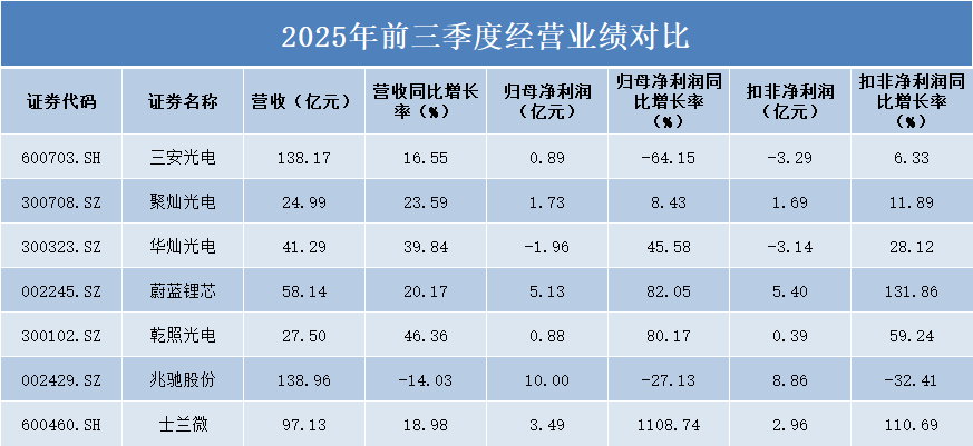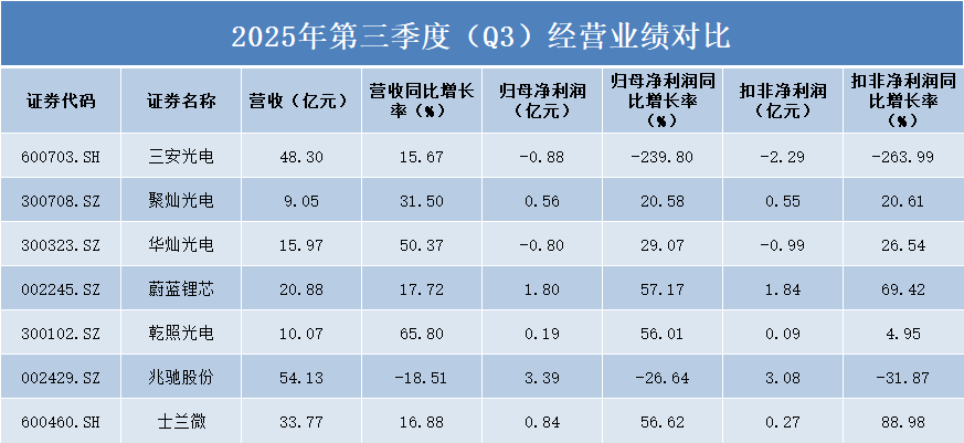 从单季度(Q3)营收规模看,兆驰股份以54.13亿元位居首位,但其营收同比下降18.51%,显示经营面临压力。三安光电和蔚蓝锂芯分别以48.30亿元和20.88亿元的营收规模位列第二、三位,且均保持正增长。