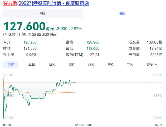 11月5日,赛力斯正式登陆港交所主板,开盘市值128.9港元/股,但随后股价一度跌至125港元/股,较发行价下降4.94%,总市值为2177亿港元。不过股价逐步回升,截至发稿股价为127.6港元/股,仍较发行价下降2.97%,总市值回升至2223亿港元。