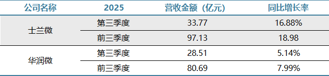 士兰微Q3单季营收33.77亿元,同比增长16.88%,年初至9月营收97.13亿元,同比增长18.98%;华润微Q3单季营收28.51亿元,同比增长5.14%,年初至9月营收80.69亿元,同比小幅增长7.99%。